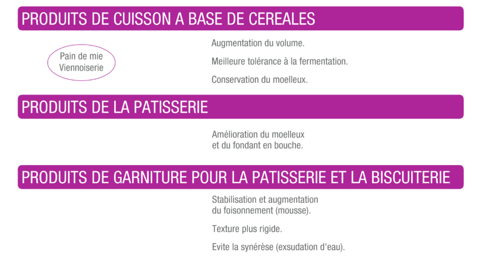 - Dans les viennoiseries, plus particulièrement : augmentation de la viscosité qui diminue le collant des pâtes et donne une texture plus homogène et amélioration du fondant en bouche.